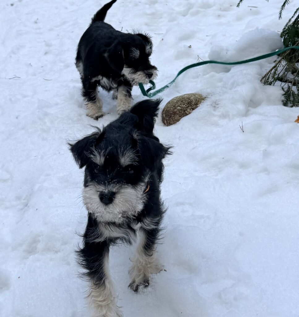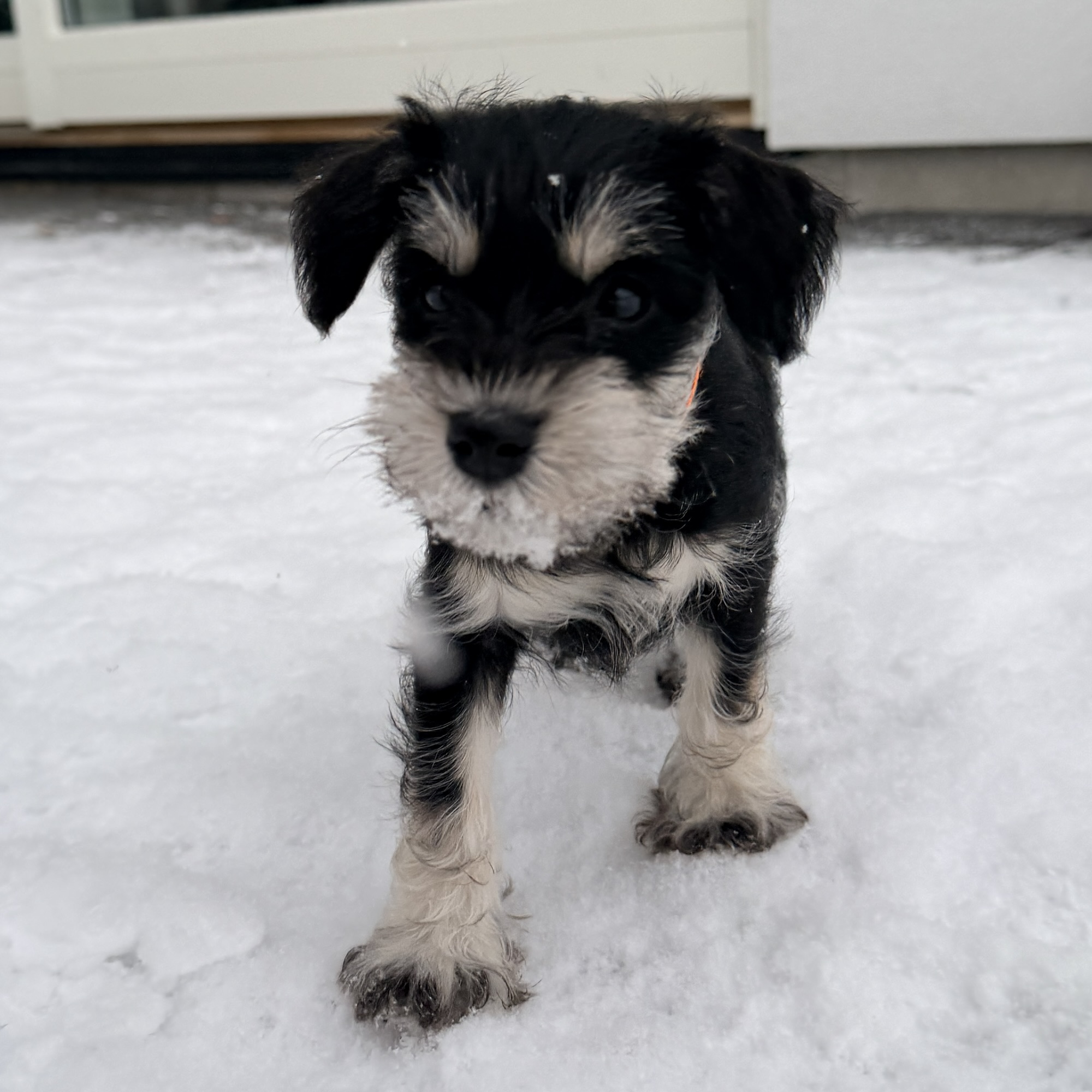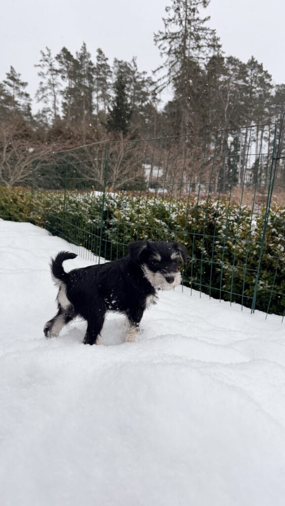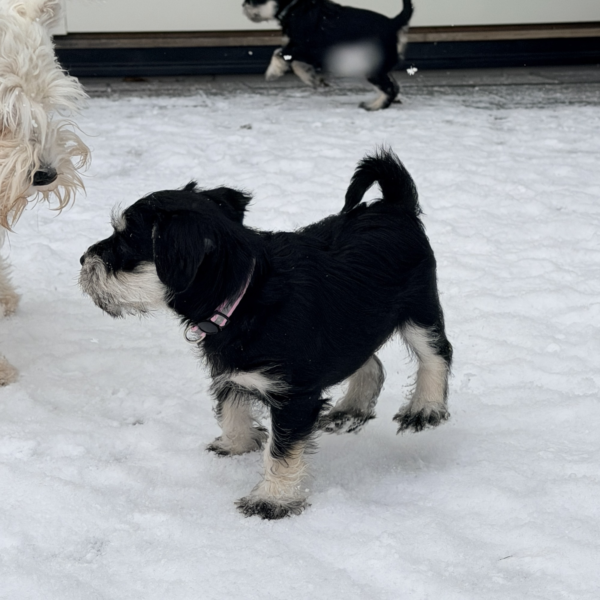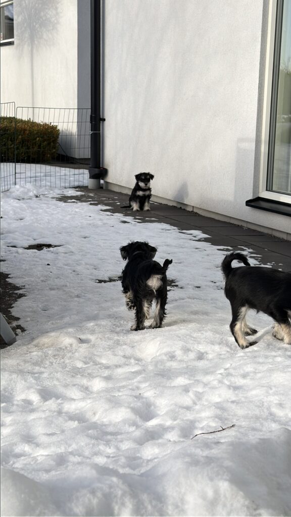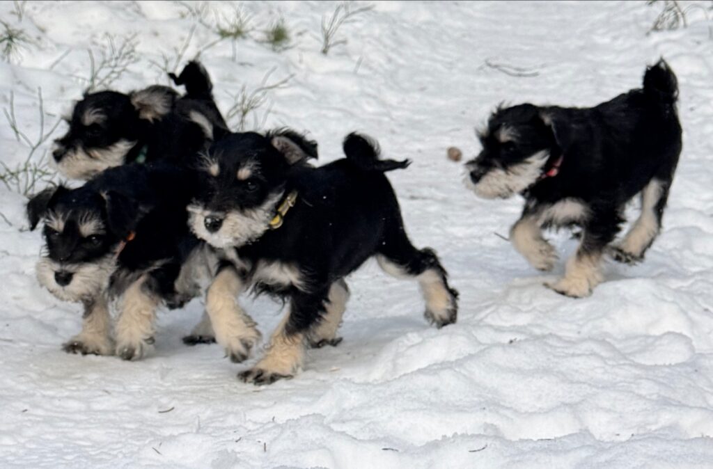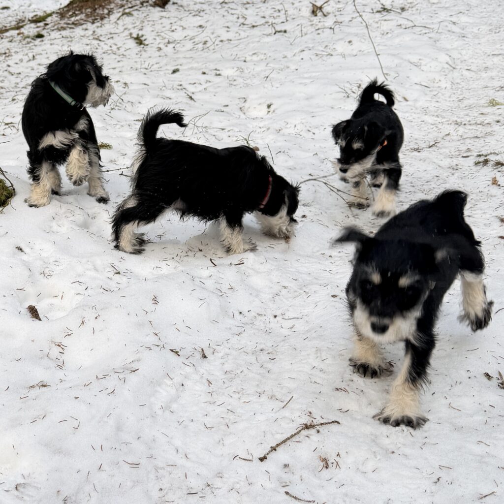 Valparna är nu 9 veckor och dagarna är fyllda av nya upplevelser. På de senaste bilderna syns de ute i skogen där de nyfiket utforskar nya dofter och underlag, hemma där de busar både ute i snön och inne på golvet, samt hos veterinären där de varit duktiga och fått sin första vaccination. Allt för att de ska lära känna nya dofter, ljud och miljöer. Alla valpar som är lika till både utseende och mentalitet lär sig nyfiket nya saker.