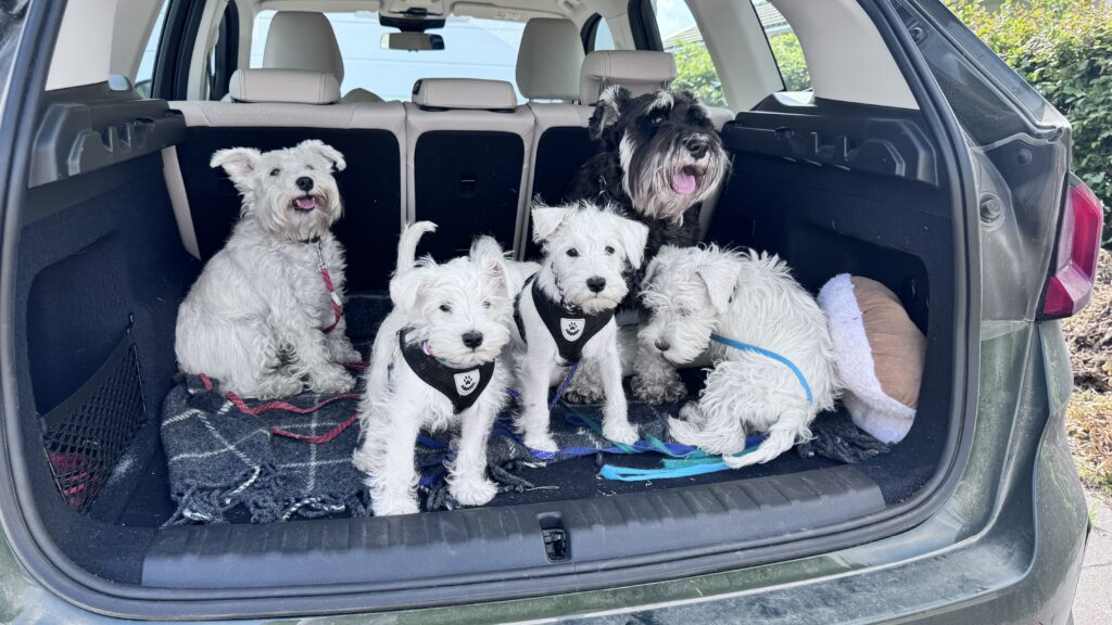 Här är alla hundar samlade i bakluckan i väntan på att åka till skogen.