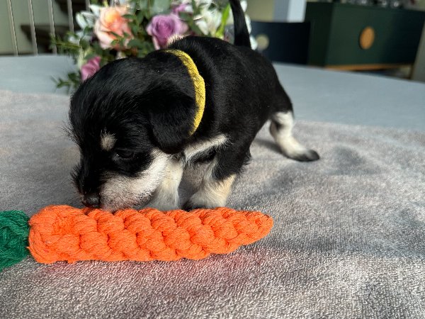 7/1 2026. Här kommer ytterligare lite fler bilder. De senaste dagarna är det full fart på alla valpar. De har fått smakportioner av mosad valpmat och köttfärs med äggula. Det underlättar för tiken. I helgen som kommer blir det kokt torsk vilket brukar vara mycket uppskattat. Tyvärr är det lite för kallt för att släppa ut dem i en utehage, hade det varit sommar så. Men nu får de vänta tills de får lite mer päls. Nu börjar valparna se ut som små schnauzrar och man ka se hur de utvecklas från dag till dag, framför allt när det gäller springandet och busandet.